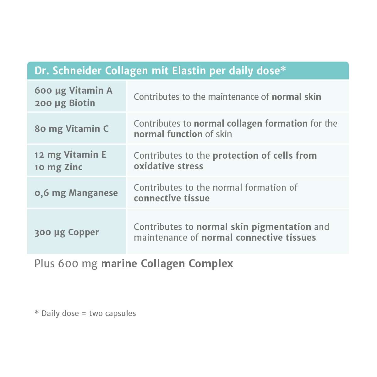 Dr. Schneider Collagen mit Elastin: Marine protein hydrolysate [fish] 62.6%, gelatine, L-ascorbic acid, DL-alpha tocopherol acetate, zinc oxide, maltodextrin, retinol acetate, anti-caking agent: magnesium salts from fatty acids, manganese sulphate, copper sulphate, D-biotin, colouring agent: titanium dioxide
