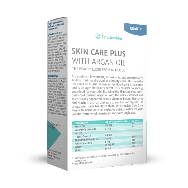 We develop our products taking the latest scientific findings into consideration and always try to select the technically most sensible but also the most innovative dosage formats for our products. In particular with Dr. Schneider Haut Spezial mit Arganöl, we have managed to pack a variety of valuable ingredients into a very small and easy-to-swallow capsule. This makes daily consumption and thus daily skin care even easier.