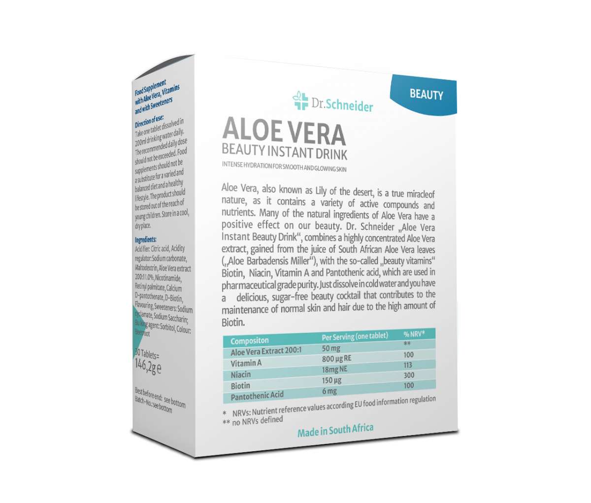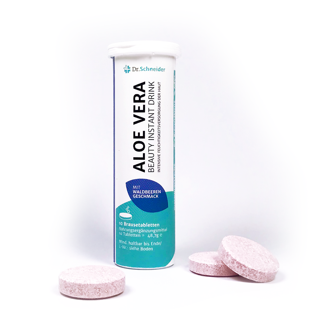 Aloe vera, also known as the desert lily, is a true miracle of nature. Many of the natural components of aloe vera have a positive effect on our beauty. In his innovative “Aloe Vera Beauty Instant drink” tablets, Dr. Schneider combines a highly-concentrated extract from the gel of the South-African aloe vera plant leaves (“aloe barbadensis Miller”) with the so-called “skin vitamins” biotin, niacin, vitamin A and pantothenic acid, which are used in their purest forms. Dissolved in cold water, the tablets produce a pleasant-tasting beauty cocktail which helps maintain natural skin and hair thanks to the high biotin content.