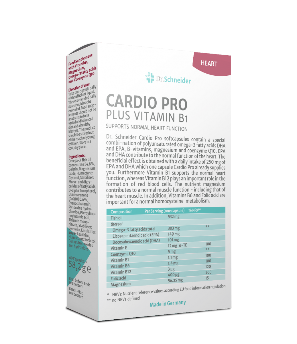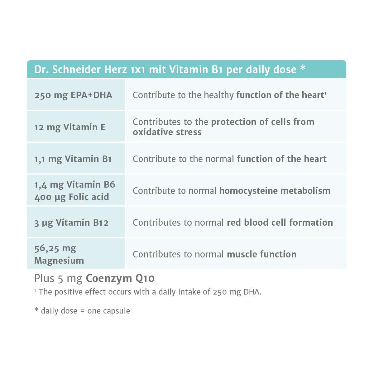 Dr. Schneider Herz 1×1 soft capsules contain a special combination of the polyunsaturated omega-3 fatty acids DHA and EPA, B vitamins, magnesium and coenzyme Q10. DHA and EPA contribute to normal heart function. The positive effect sets in at a daily dosage of 250 mg EPA and DHA, which just one capsule of Herz 1×1 will provide you with. Vitamin B1 also supports normal heart function, whereas vitamin B12 plays an important role in the normal formation of red blood cells. The nutrient magnesium contributes to normal muscle function – including that of the heart muscle. Additionally, vitamin B6 and folic acid play a role in a normal homocysteine metabolism and thereby make a positive contribution to heart health.
