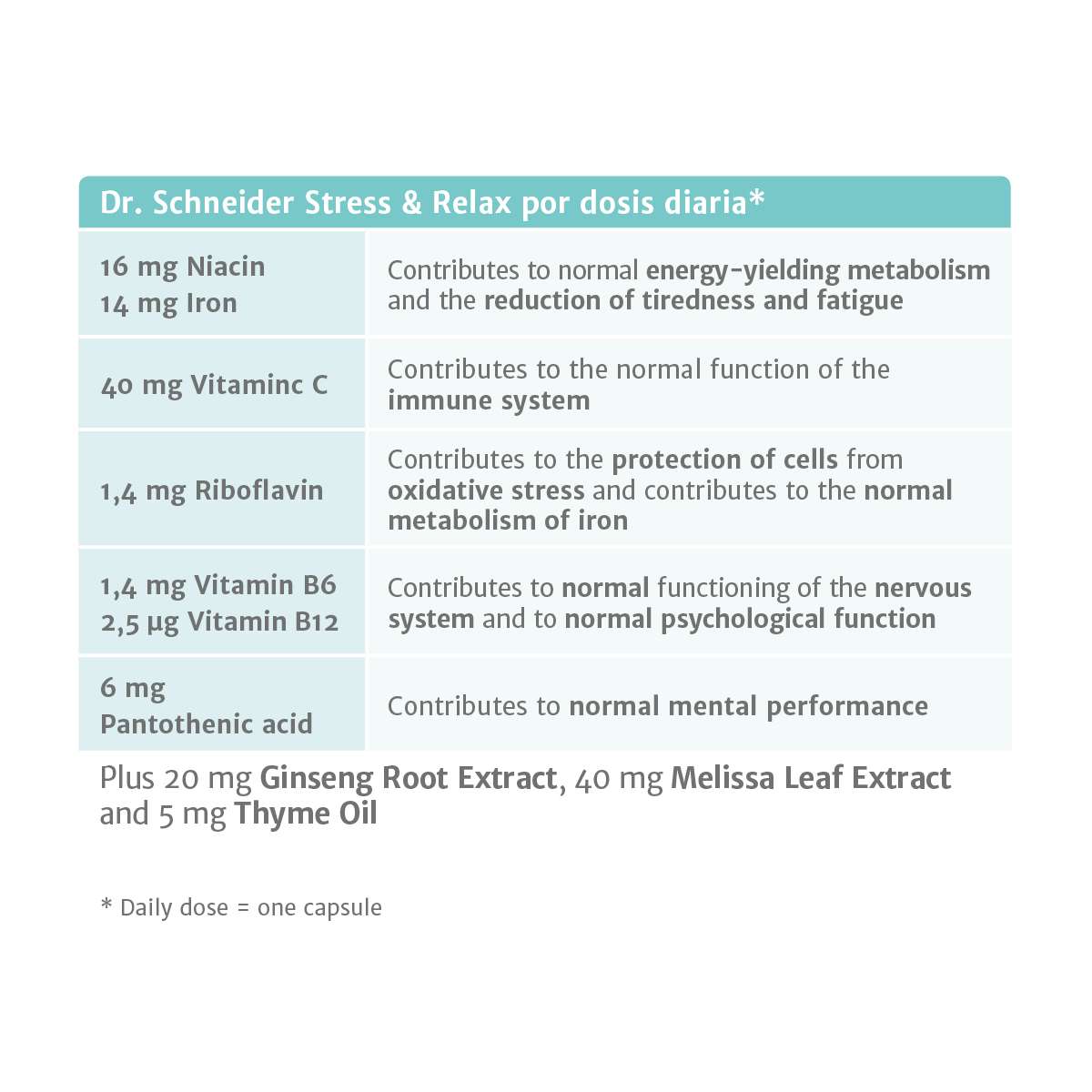A hectic lifestyle, stress, strain at work and at home often leads to feelings of physical and mental exhaustion. Our nervous systems and brains depend in these particular situations on a sufficient supply of nutrients. Selected vitamins and minerals can make a valuable contribution here. Independent scientists at the EFSA have confirmed that the nutrients iron, niacin and vitamin B12 that are contained in Dr. Schneider Stress & Relax can contribute to a normal energy metabolism and to a reduction in tiredness and exhaustion.