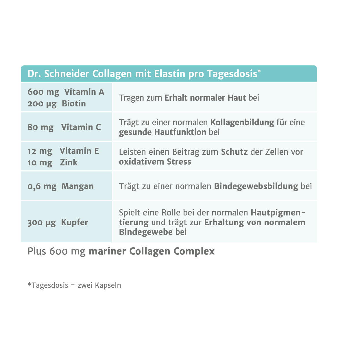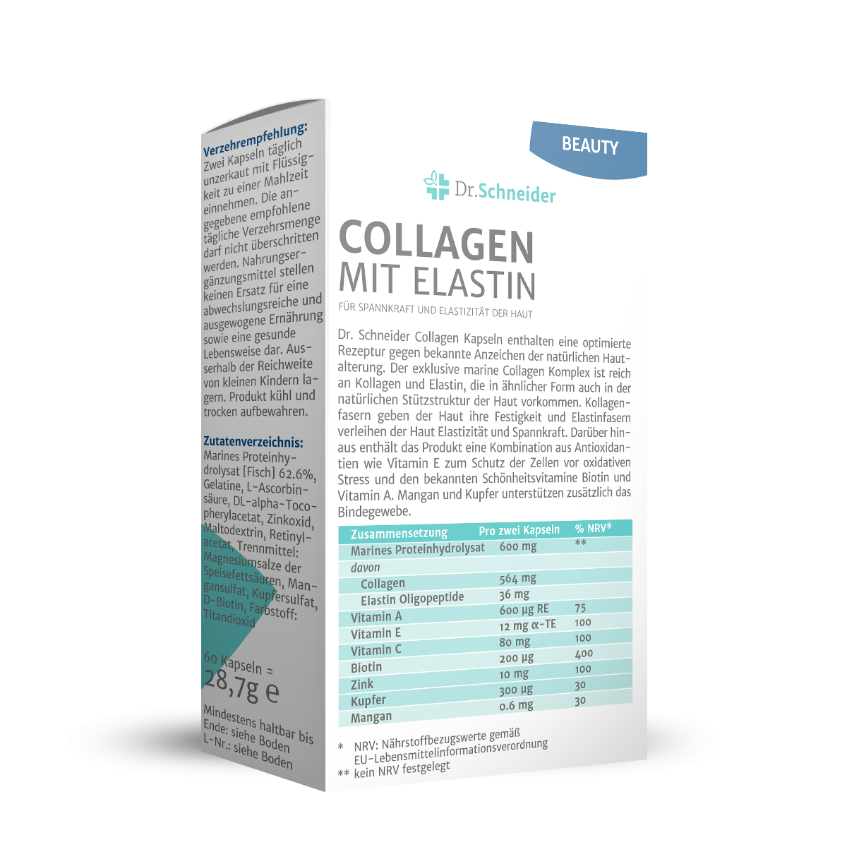 • Dr. Schneider Collagen mit Elastin: Mit einem speziellen marinen Collagen Komplex für ein schönes, ebenmäßiges Hautbild.