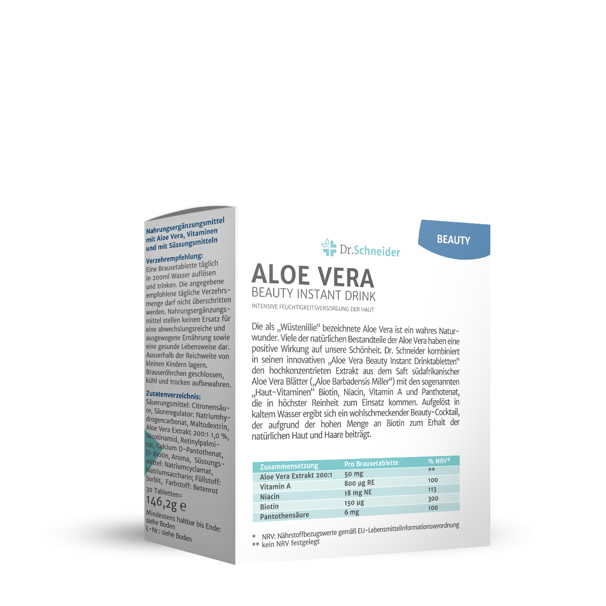 - Dr. Schneider Aloe Vera Beauty Instant Drink: Intensive Feuchtigkeitsversorgung der Haut. Mit Biotin, Niacin und Vitamin A, aber ohne Zucker!