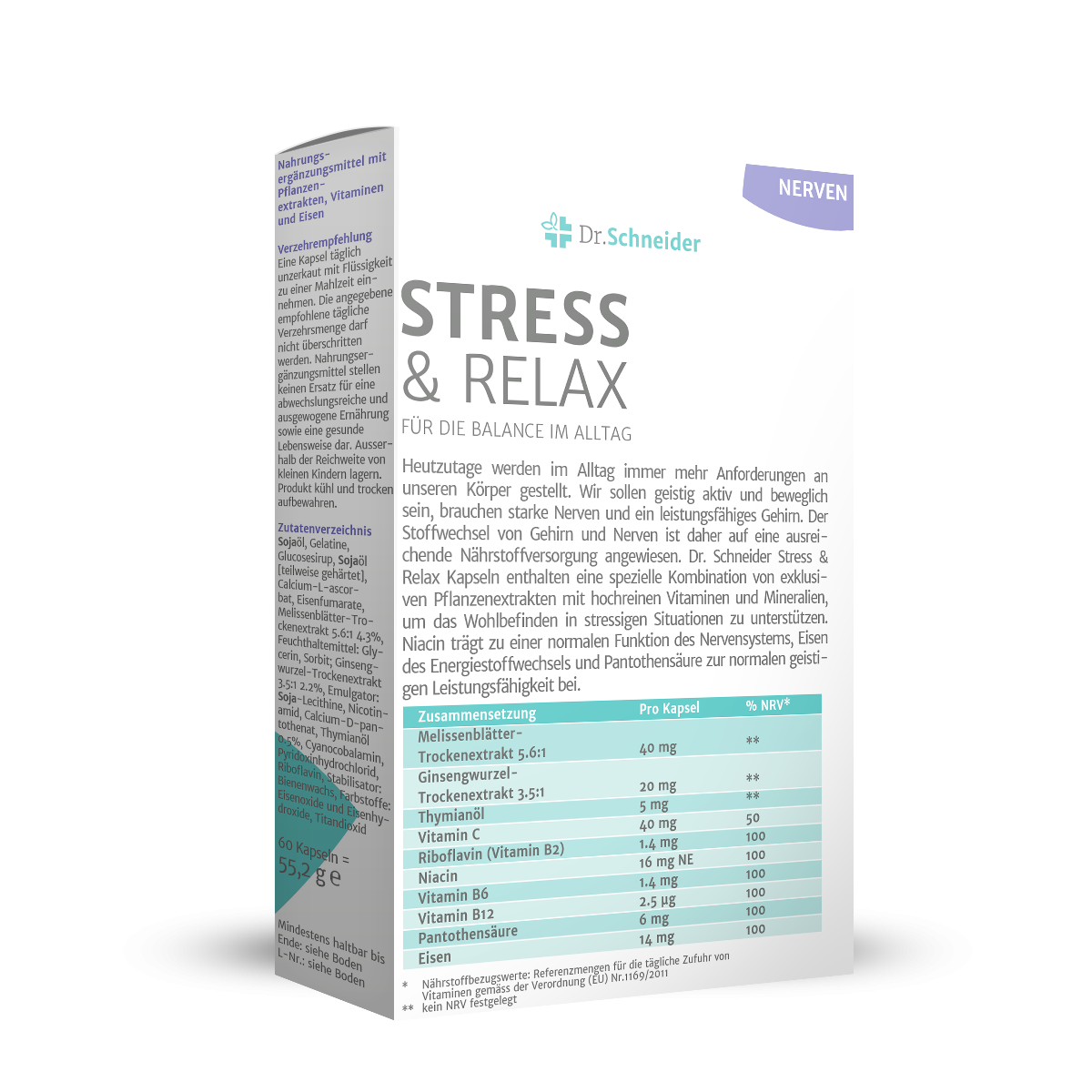 Heutzutage werden im Alltag immer mehr Anforderungen an unseren Körper gestellt. Wir sollen geistig aktiv und beweglich sein, brauchen starke Nerven und ein leistungsfähiges Gehirn. Der Stoffwechsel von Gehirn und Nerven ist daher auf eine ausreichende Nährstoffversorgung angewiesen. Dr. Schneider Stress & Relax Kapseln enthalten eine spezielle Kombination von ausgewählten Pflanzenextrakten mit hochreinen Vitaminen und Mineralien, um das Wohlbefinden in stressigen Situationen zu unterstützen. Niacin trägt zu einer normalen Funktion des Nervensystems, Eisen des Energiestoffwechsels und Pantothensäure zur normalen geistigen Leistungsfähigkeit bei. Vitamin C trägt zusätzlich zu einer normalen Funktion des Immunsystems bei und schützt die Zellen vor oxidativem Stress.