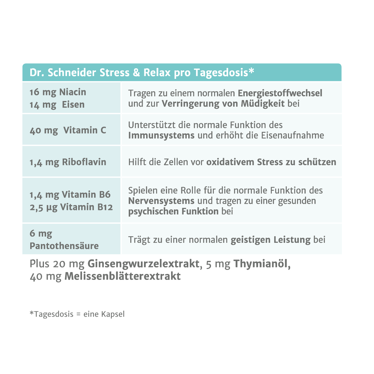 Hektik, Stress, berufliche und private Überlastungen führen oft dazu, sich körperlich und geistig erschöpft zu fühlen. Unsere Nerven und unser Gehirn sind in diesen speziellen Situationen auf eine ausreichende Nährstoffversorgung angewiesen. Ausgewählte Vitamine und Mineralien können hier einen wertvollen Beitrag leisten. Unabhängige Wissenschaftler der EFSA haben bestätigt, dass die in Dr. Schneider Stress & Relax enthaltenen Nährstoffe Eisen, Niacin und Vitamin B12 zu einem normalen Energiestoffwechsel und zur Verringerung von Müdigkeit und Ermüdung beitragen können.